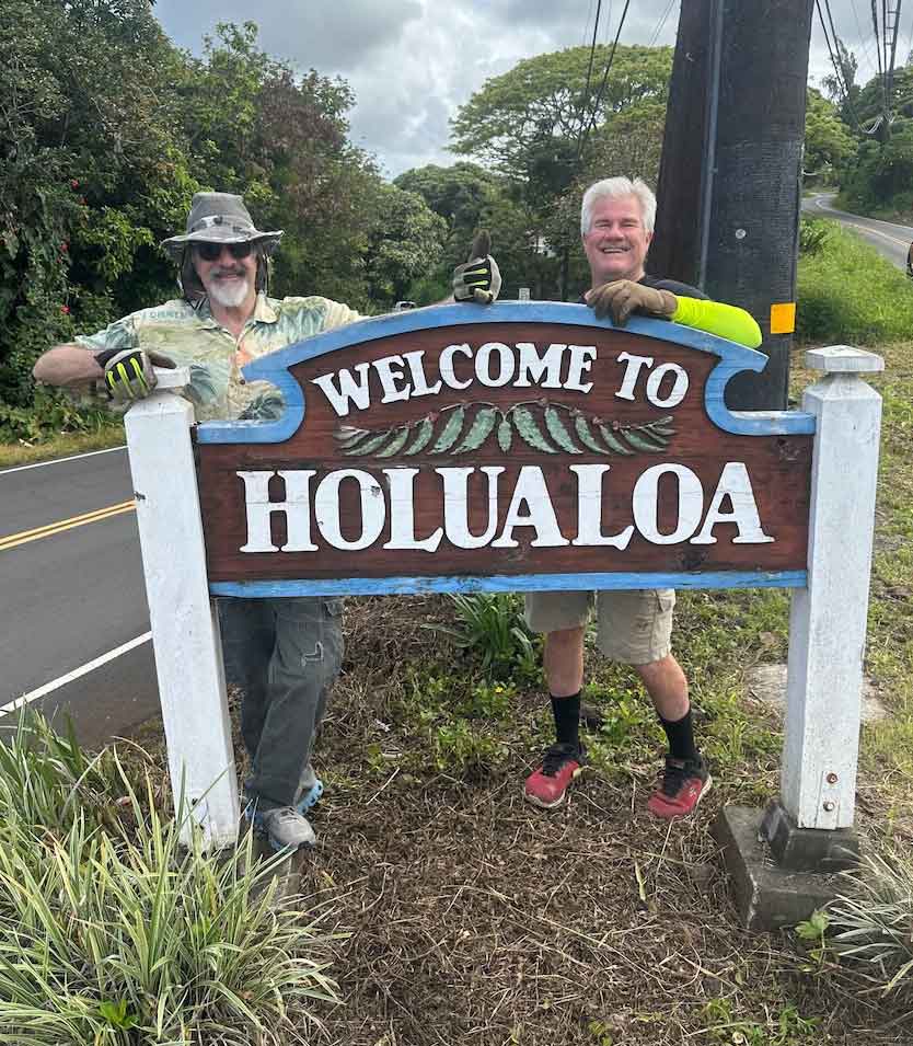After welcoming residents and visitors for many years, time and the tropics had taken its toll on our iconic Holualoa Village sign. The carved wooden sign, at the junction of Hualalai Road and Mamalahoa Highway, had seen better days, and the dry rot was on its way to winning…until community heroes Bill Wingert and Doug Kinnear swooped in to save the day.