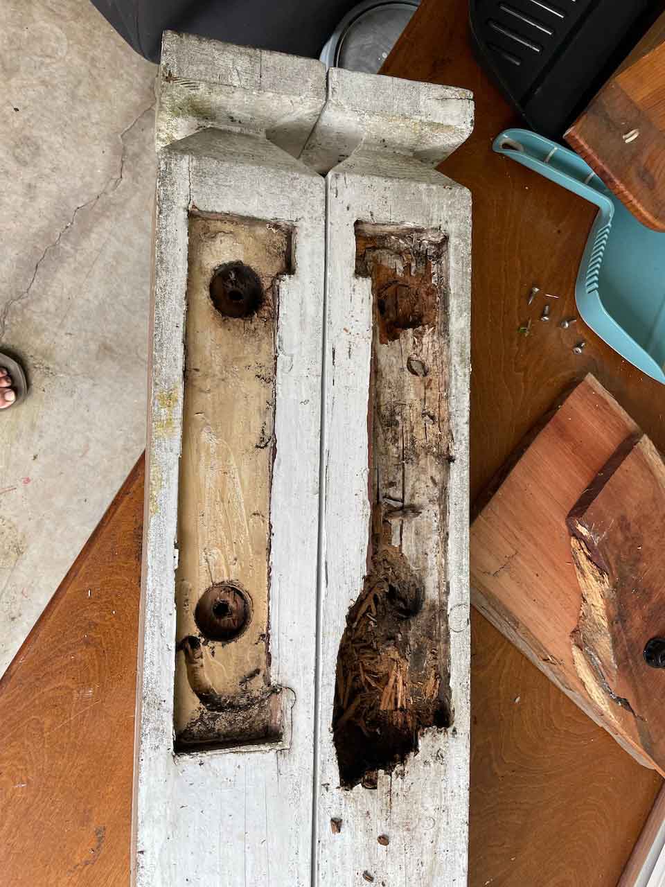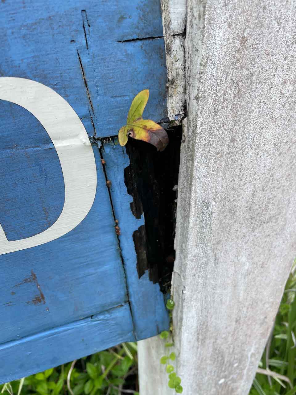 This sign had years of rotting slowly developing in the lower back right hand side, primarily due to gradual sinking of the footing supporting its post. The front of the sign had signs of weathering, including a missing serif and a couple of missing coffee leaves, but Bill felt it the front could be easily restored if the rot in the backside was dealt with. Bill and I volunteered to restore the sign together.