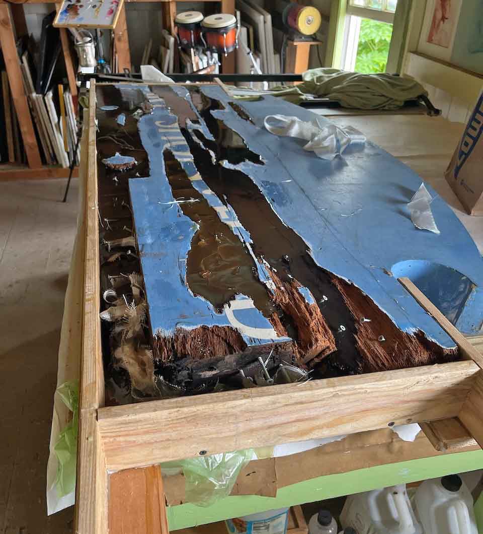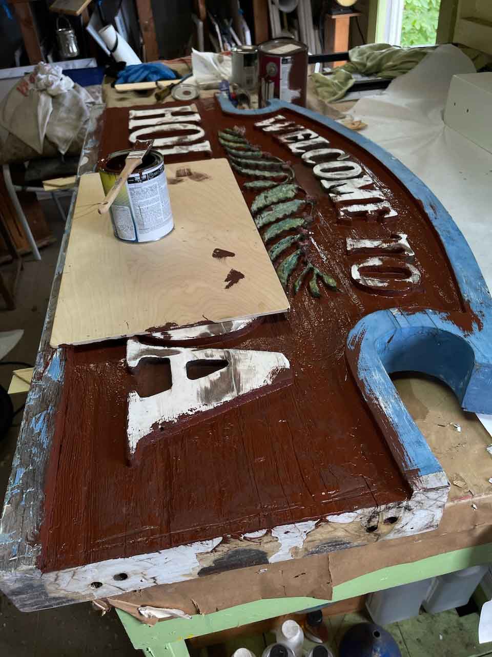 As Bill is a busy professional artist and musician, work on the sign was sporadic, but extensive. After a month of drying and evacuating all the rotted wood, a frame was built around the sign to hold quarts of fiberglass resin filling in all the pukas left after removing the rotten wood. The front lettering and background was then restored along with the coffee garland. Everything was then painted with multiple coats of paint.